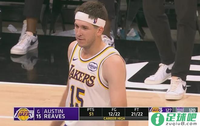 单核带队的里夫斯,投篮22中12,其中三分10中6,罚球22中21狂轰51分11板9助炸裂数据,正负值+22,湖人127-120击败国王。