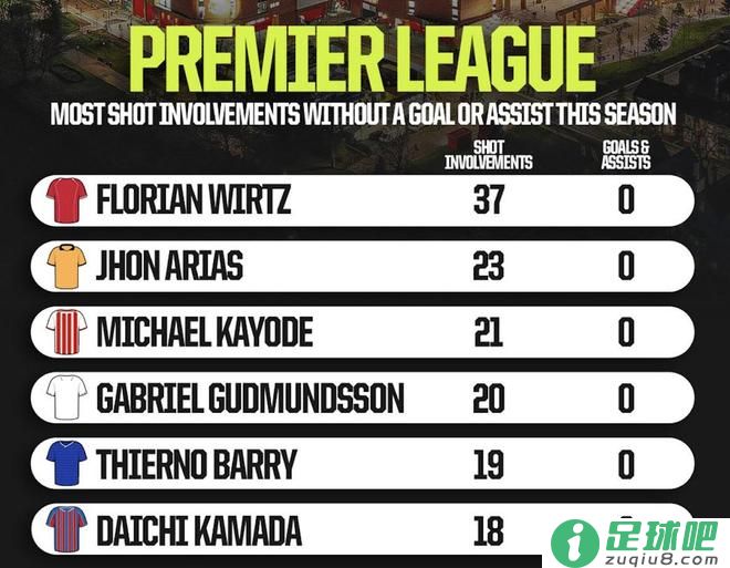 据统计,维尔茨一共参与了37次射门,是本赛季英超0球0助的球员中最多的。