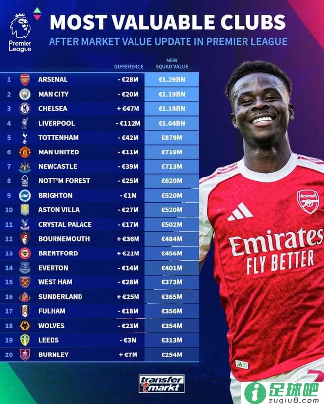 德转英超俱乐部身价排名:阿森纳12.9亿第1、曼城切尔西二三位