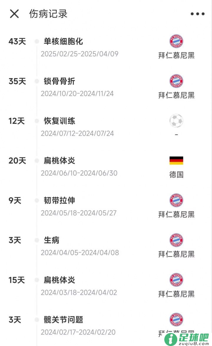 拜仁官方发布公告,21岁中场帕夫洛维奇因训练中眼窝骨折将列席一段时间。扁桃体炎:缺阵15天扁桃体炎复发:因此列席欧洲杯,尔后停止扁桃体手术摘除锁骨骨折:缺阵3...发表于:08月02日 -