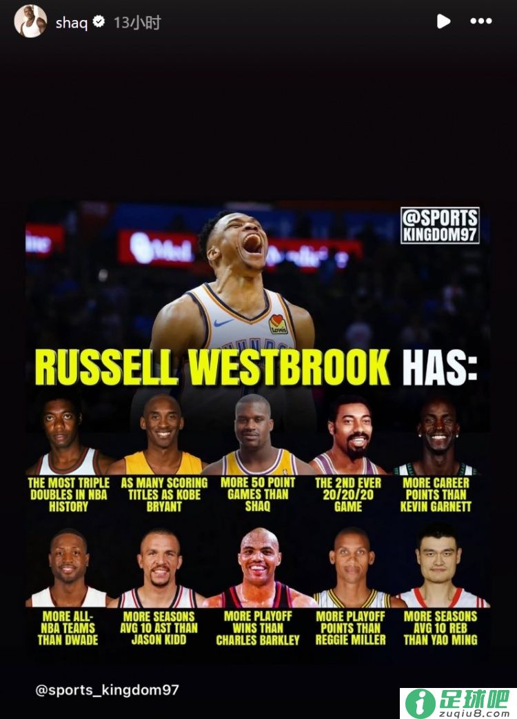 威少生涯数据荣誉汇总:三双王得分王和科比一样多等奥尼尔转发相关内容