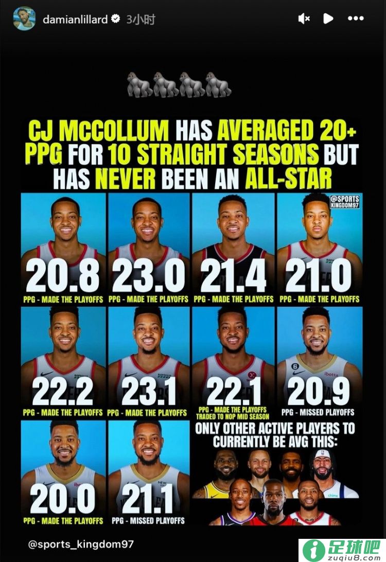 CJ延续10年场均得分20+但从未进过全明星!利拉德为老队友鸣不平相关内容