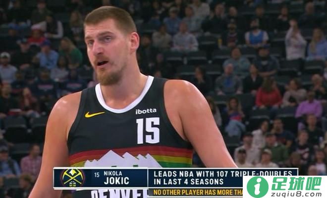 竞赛时期,转播方给出一组数据:在过去四个赛季中,约基奇共完成了107次三双,而其他球员最多则不超越55次三双。