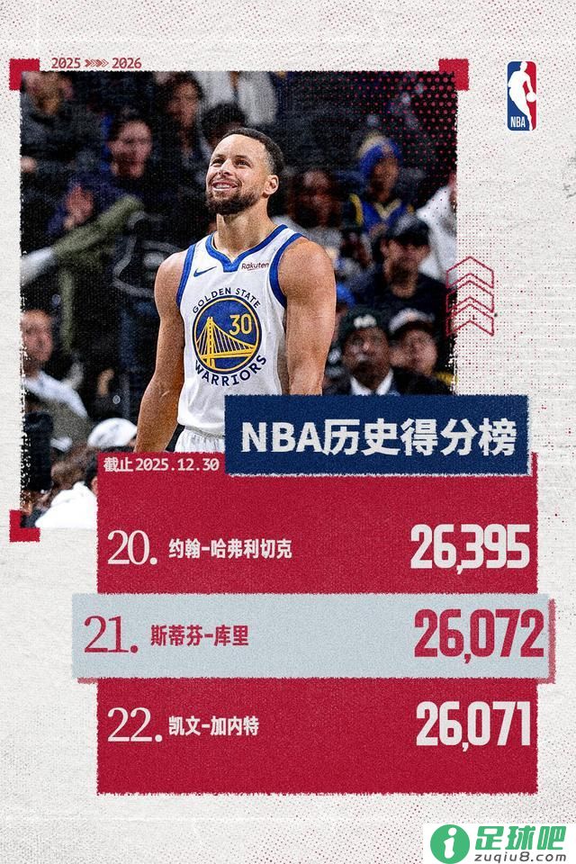 据统计,本场竞赛事先,库里的生涯总得分正式逾越凯文-加内特,升至NBA历史得分榜第21位。