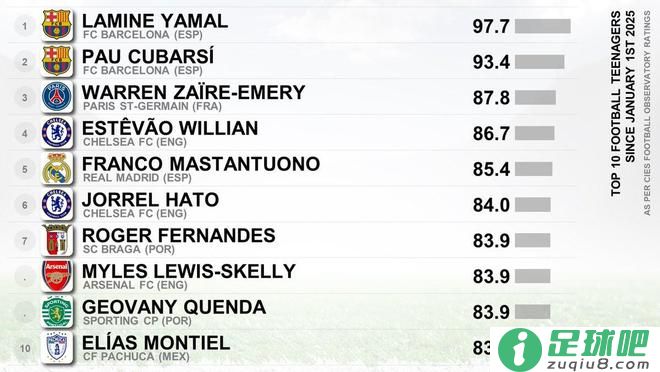 CIES评选最佳U20外场球员:亚马尔居首、库巴西、埃梅里紧随其后