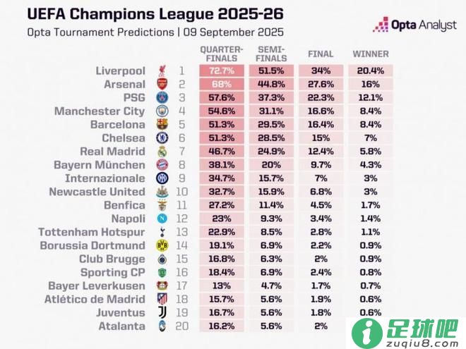 opta预测欧冠夺冠概率:利物浦20.4%居首,阿森纳次席,巴黎第三