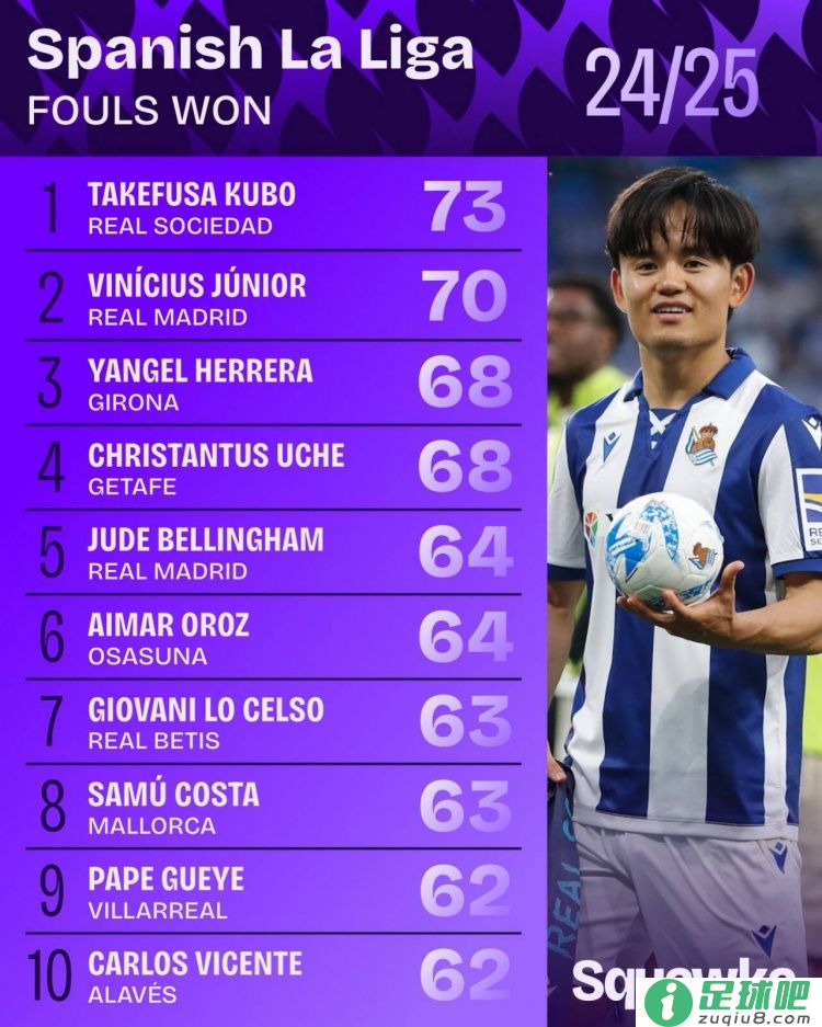数据平台Squawka昔日发布了本赛季西甲联赛被犯规次数榜,其中日本中场久保建英以73次被犯规居首,维尼修斯70次排名次席,贝林厄姆64次排在第5位。