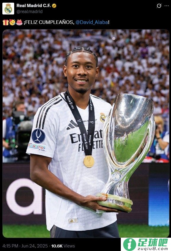 大卫阿拉巴迎来33岁生日,皇马、奥天时国度队官推送祝愿相关内容