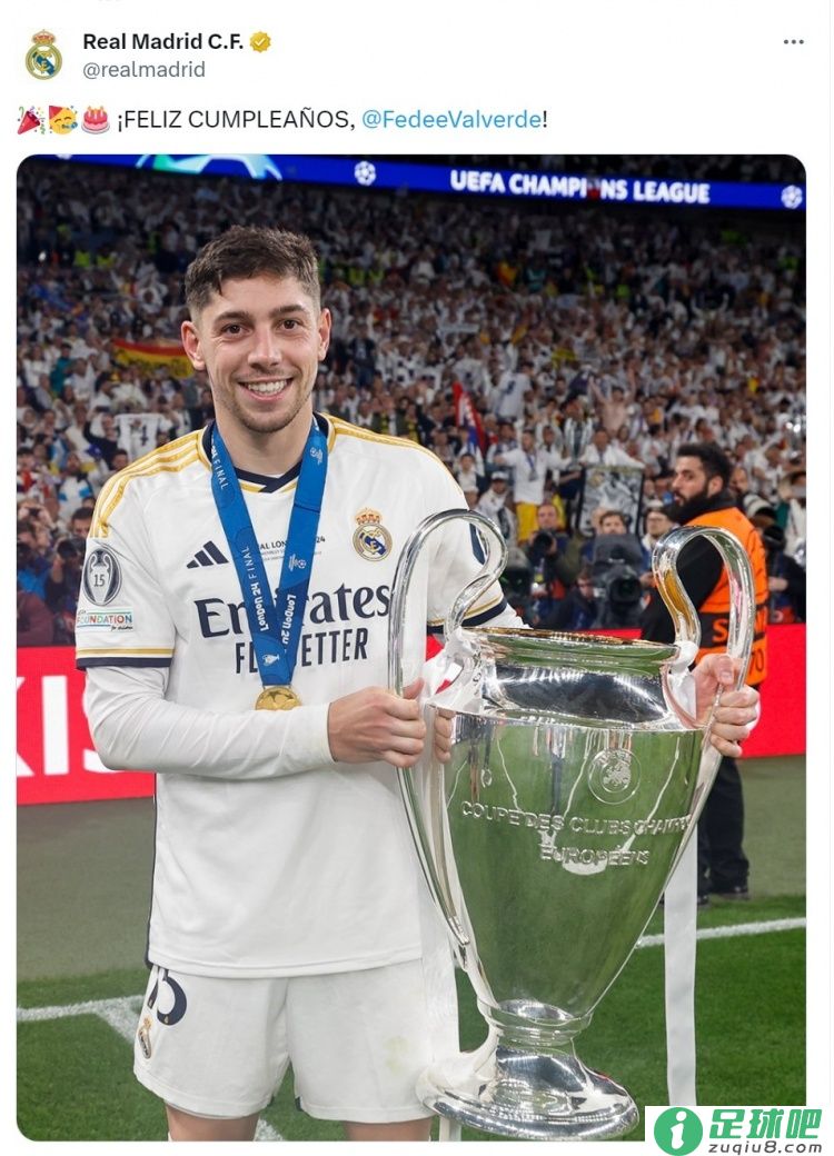 明天是皇马中场巴尔韦德的27岁生日,皇马官方为他送上祝愿。皇马官方社媒晒出巴尔韦德与欧冠奖杯的合照,配文:“生日快乐,巴尔韦德!”...发表于:07月22日 -