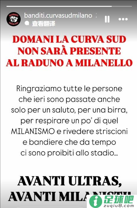 声明中写道:“明天我们不会在米兰内洛的季前首训时集结。我们感谢昨天(在南看台年终聚会上)一切来访的冤家,不论是来打个招呼、喝杯啤酒,还是为了感受那份‘米兰主义’,偏重新看到那些早已在球场被制止的横幅和旗帜……向前走,Ultras,向前走,红黑米兰主义者!”