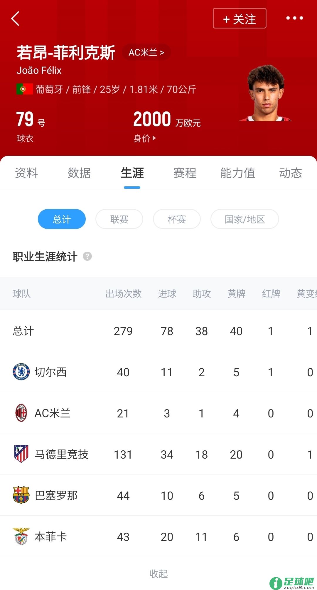 职业生涯至今菲利克斯的累计转会费曾经到达了1.957亿欧↓