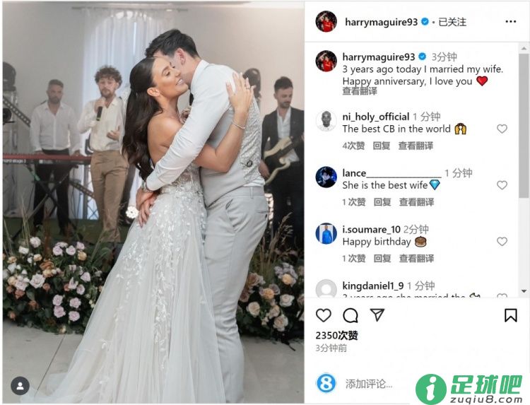 马奎尔社媒晒婚礼照片,庆贺与妻子结婚三周年纪念日相关内容