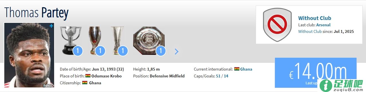 德国转会市场页面显示,32岁的阿森纳中场托马斯合同到期,曾经成为自在身球员。