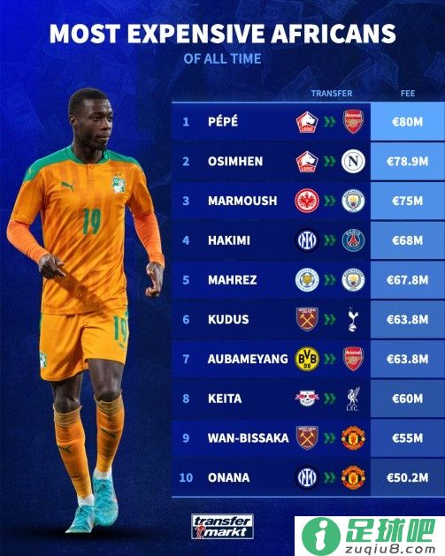 德转网站统计了非洲球员的最高转会费,佩佩从里尔加盟阿森纳的8000万欧元居首,详细状况如下:
