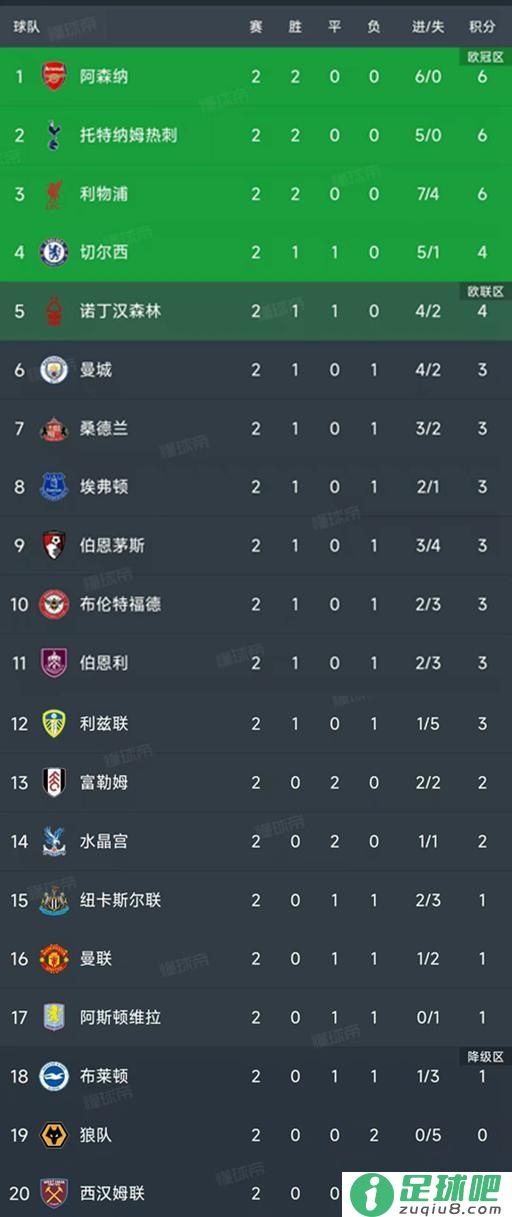 阿森纳和热刺是目前独一连胜,而且没有丢球的队伍,阿森纳5-0大成功兹联,是本轮最大的分差。热刺客场2-0打败了曼城,两场竞赛算计攻入了5球,能在曼城的主场赢球,热刺新赛季的备战还不错,他们要防止高开低走。切尔西和诺丁汉森林都是1胜1平积4分暂列第4和第5名。