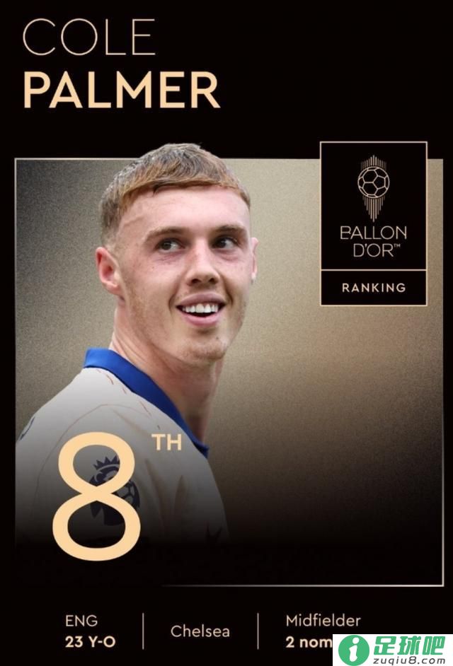 2025金球奖颁奖仪式,切尔西/英格兰球员帕尔默最终排名第8。帕尔默上赛季一共为切尔西打入15球并有14次助攻,今夏协助蓝军取得世俱杯冠军。