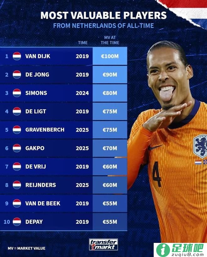 德转列荷兰球员历史身价榜:范戴克第1,德容、德利赫特在列