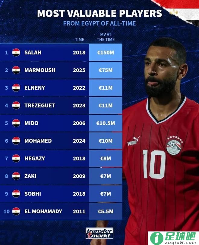 德转列埃及球员历史身价榜:萨拉赫1.5亿第1,马尔穆什第2