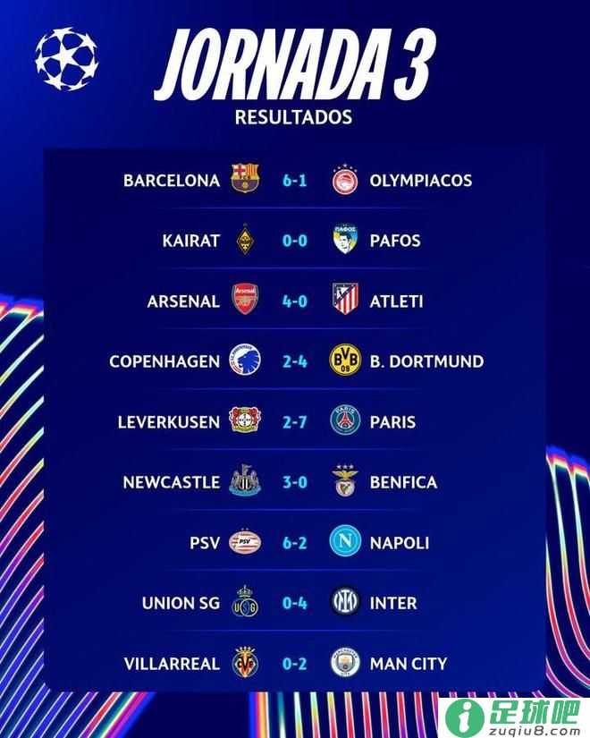 本轮欧冠前9场竞赛详细比分: