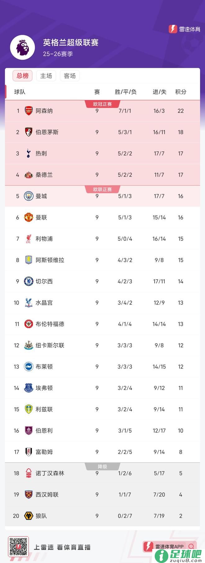 英超第九轮竞赛曾经全部完毕,积分榜方面,阿森纳22分继续领跑,伯恩茅斯第二,热刺、桑德兰分列三四位。