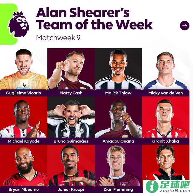 中场:吉马良斯(纽卡)、阿马杜-奥纳纳(维拉)、扎卡(桑德兰)