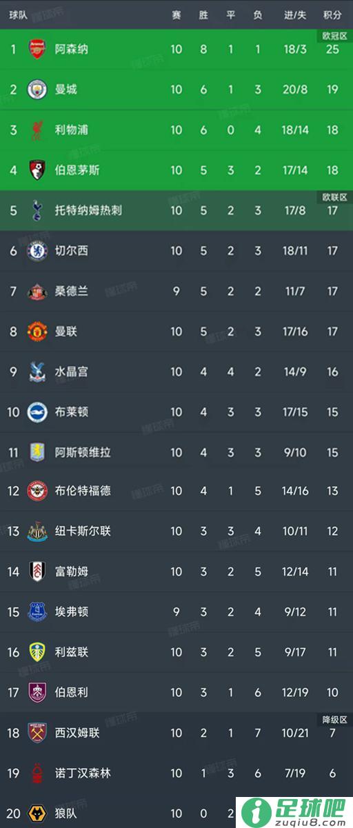 热刺、切尔西、桑德兰和曼联的积分都是17分暂列第5-第8名,热刺本轮0-1不敌切尔西,桑德兰本轮的竞赛还没有停止,对手是埃弗顿,曼联三连胜脚步被终结,2-2和诺丁汉森林握手言和。水晶宫16分暂列第9名。阿斯顿维拉和布伦特福德都是15分暂列第10和第11名。