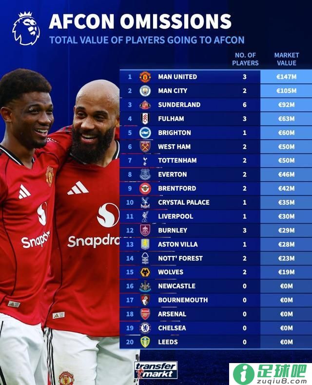 德转列英超球队非洲杯参赛球员总身价榜:曼联3人1.47亿欧第1相关内容