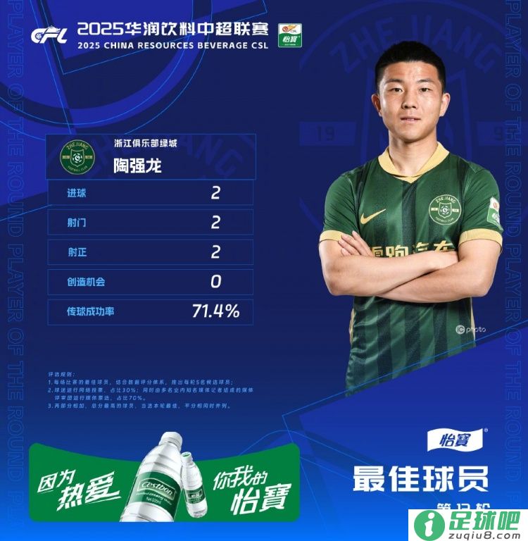 中超联赛官方发布了第13轮最佳球员的评选结果,浙江队球员陶强龙仰仗梅开二度的表现,成功中选。在2025华润饮料中超联赛第13轮中,浙江队主场对阵河南俱乐部酒祖...发表于:06月22日 -