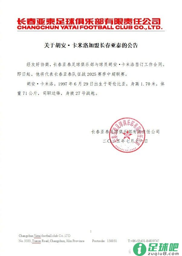 关于胡安卡米洛加盟长春亚泰的公告相关内容