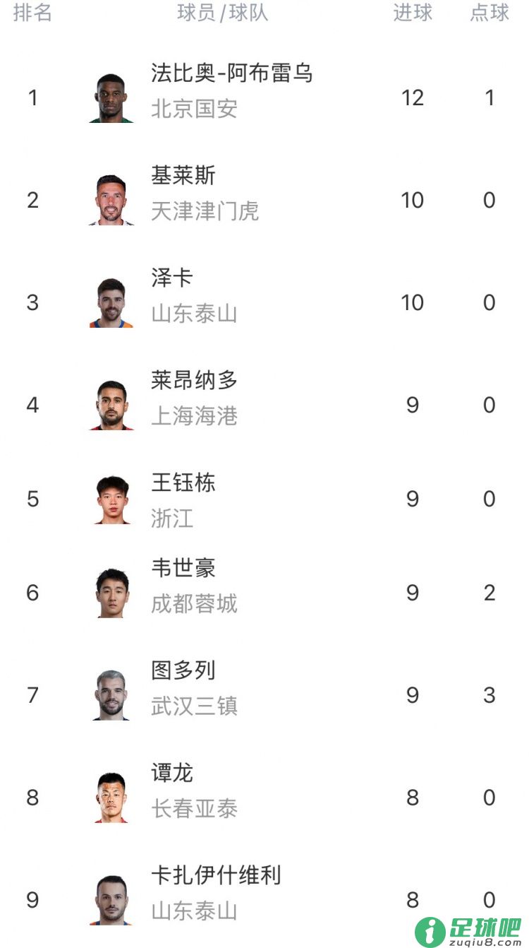 中超射手榜:法比奥12球领跑,基莱斯、泽卡10球排名第二