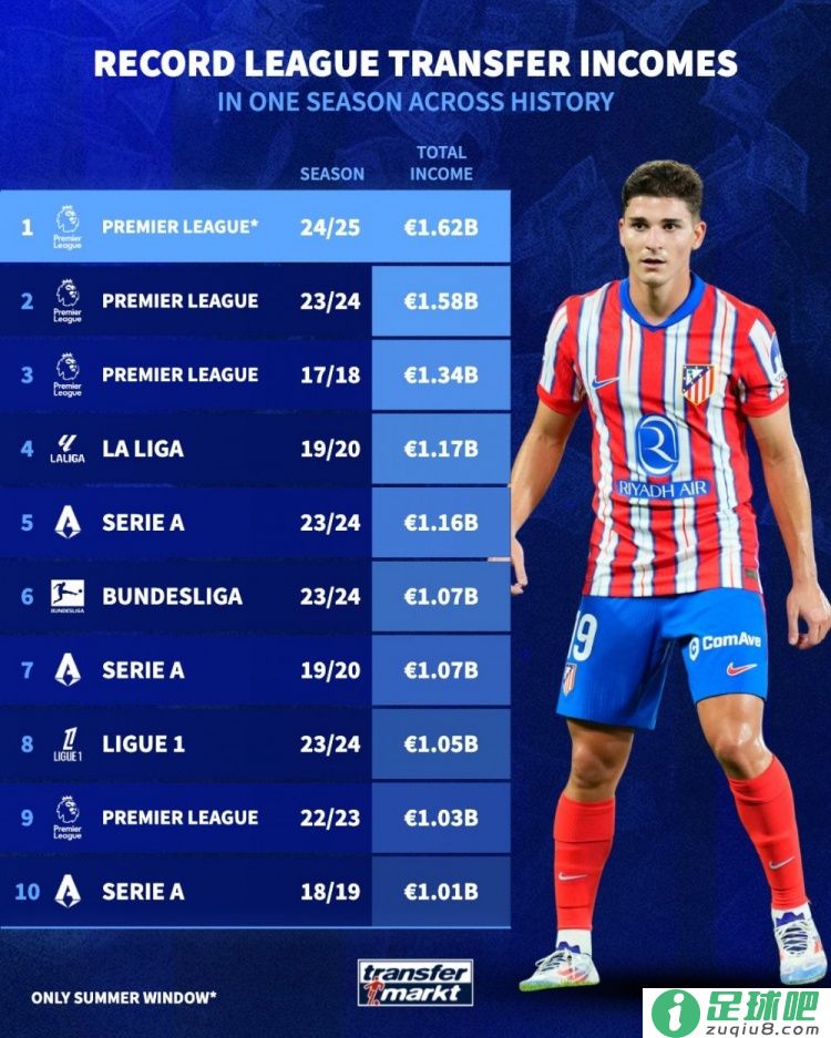 16.2亿欧元!英超往年夏窗转会支出创下历史新高相关内容